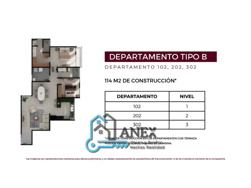 Recuerda que las propiedades mostradas pueden incluir o no ciertos aditamientos como cocina, closets, cancelería, espejos etc. Por favor consuta con tu asesor ANEX sobre las opciones que se pueden incluir en la propiedad.